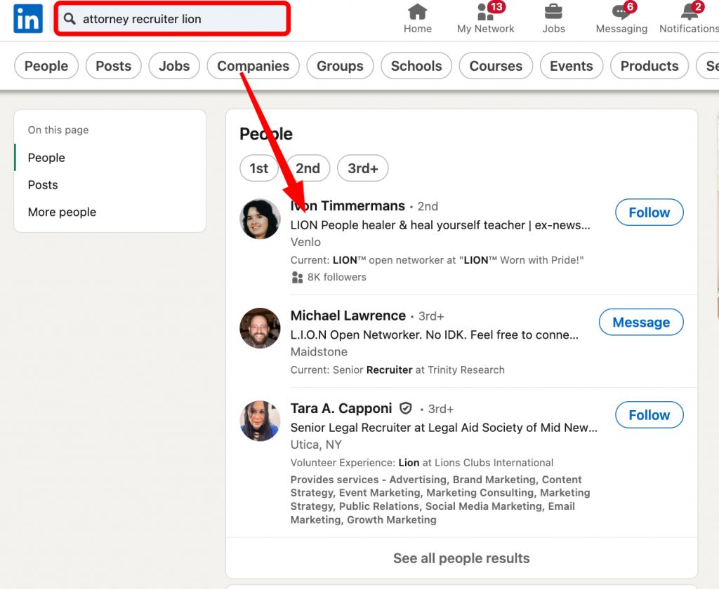 Enter the search string “LION” or “L.I.O.N.” if the niche isn’t important to you. If you’re looking for specific types of users, try entering the niche name before the word. For example, “attorney recruiter LION.”