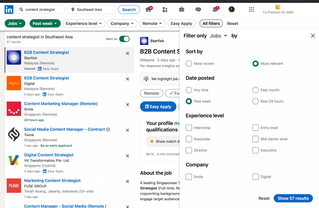 📌 Pro Tip: Pair each saved job with a related alert. For example, if you save a Marketing Manager role in Singapore, create an alert for “Marketing Manager Singapore” so you won’t miss similar postings.